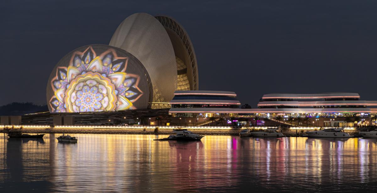 燈光投影項目以珠海大劇院外墻為“幕布” ,周邊安裝有34臺32000流明Barco激光投影、1114盞泛光燈、圖形燈及電腦燈,于2019年11月投入使用,2021年2月正式啟動商業運作,是中國唯一的海島地標媒體