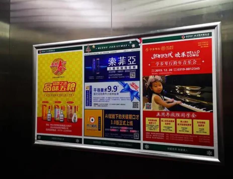 蘇州電梯框架廣告也稱電梯海報廣告,是一種靜態(tài)廣告形式,廣告位置在電梯轎廂內(nèi)側(cè)或者電梯等候廳墻壁上,畫面尺寸為420mm*570mm。是電梯廣告各種形式中投放量最多的廣告形式。