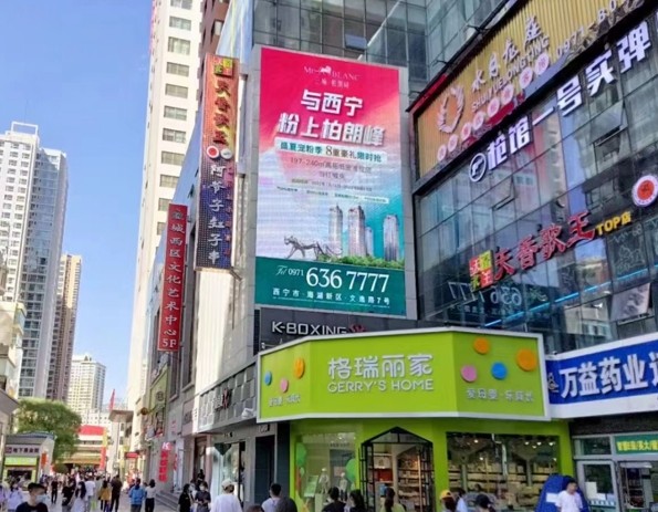 該屏位于西寧市花園北街口,湟光十字東北角恒潤(rùn)大廈,其色彩飽滿,動(dòng)態(tài)畫面或多幀切換效果,戶外超清P6顯示屏,畫面展示內(nèi)容更加豐滿,廣告訴求表達(dá)更為完善,強(qiáng)化廣告內(nèi)容可看性。