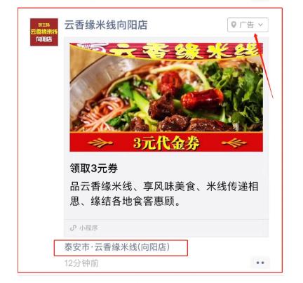 (5)門店標識(有線下門店可展示):點擊跳轉門店詳情頁,可拉起地圖導航、一健撥號功能,支持單條廣告多門店投放(上限100家)。