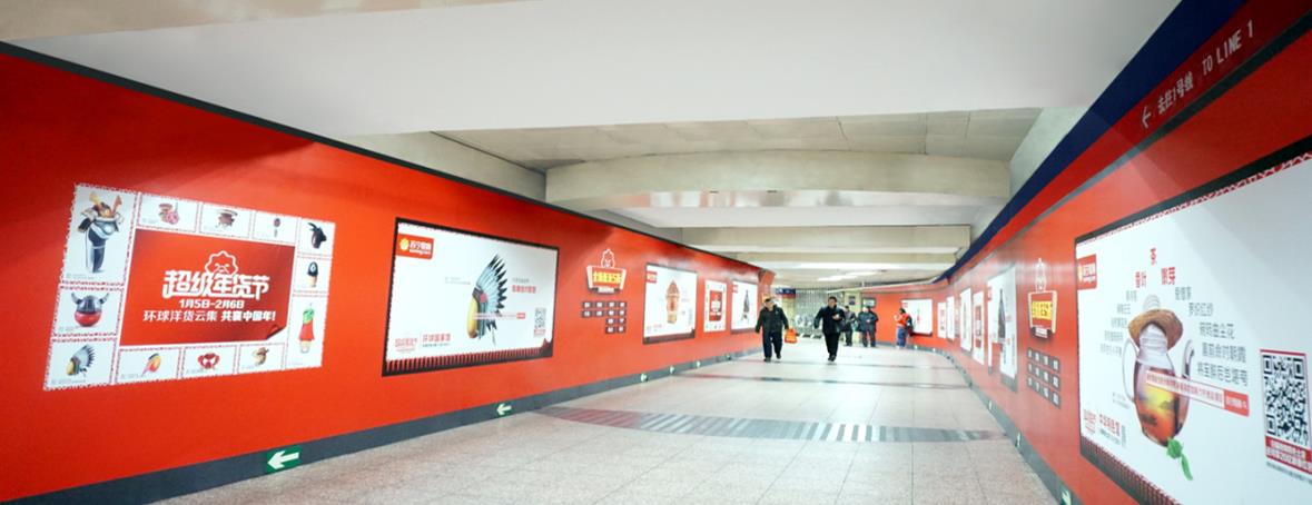 大型品牌區域墻貼位于地鐵通道走廊,曝光率極大,極據震撼力、影響力、沖擊力!大型企業品牌曝光極線上二次傳播的必備武器。價格居高