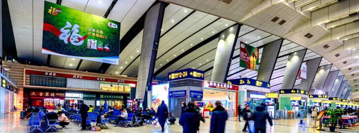 ?候車大廳進站,候車及餐飲區(qū)均可觀望,人流密集,黃金互動傳播機遇,廣告畫面效果震撼。