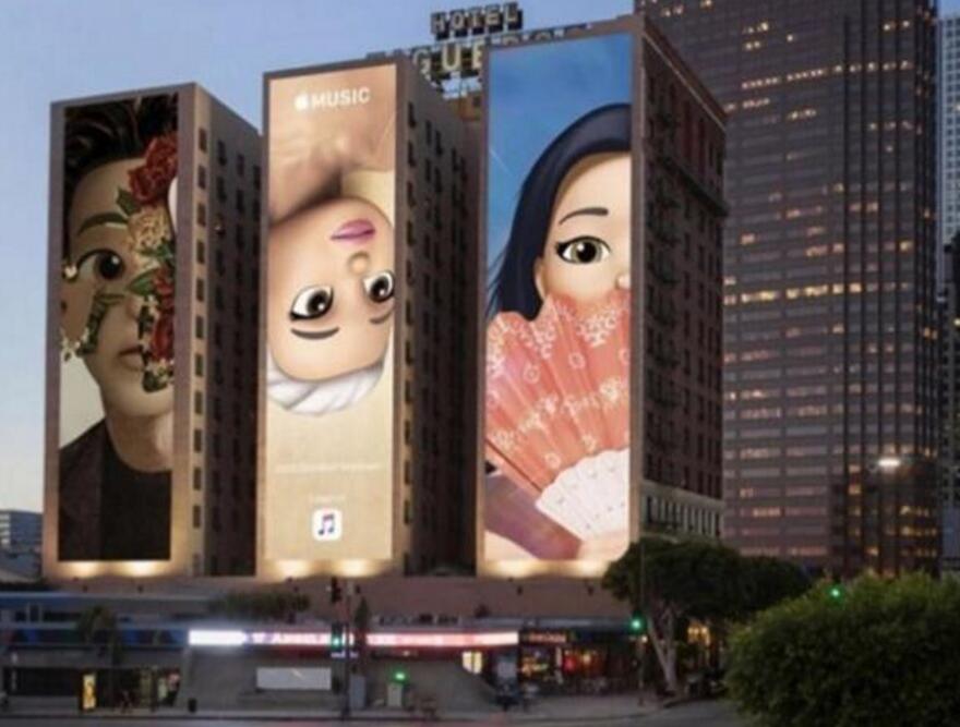 在洛杉磯著名的菲格羅亞酒店前,一套由Memoji版歌星宣傳畫組成的巨幕三聯畫布滿三棟建筑的外墻,不遠處就是格萊美頒獎典禮的主會場斯臺普斯中心。三聯畫分別是由Memoji自定義表情組成的Ariana Grande、Kacey Musgraves和Shawn Mendes,頗為引人注目。