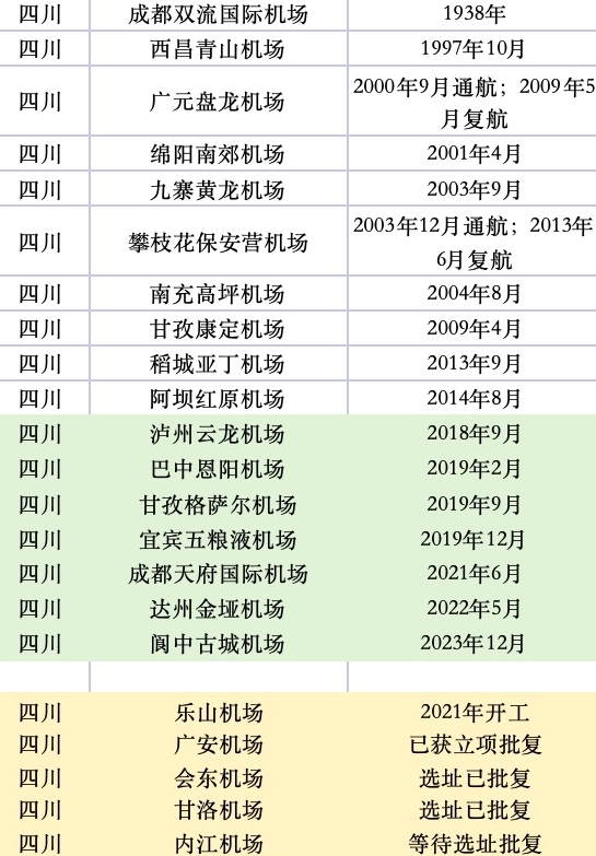 2018年以來,四川已建成7個民用機場,分別為瀘州云龍機場、巴中恩陽機場、甘孜格薩爾機場、宜賓五糧液機場、成都天府國際機場、達州金埡機場、閬中古城機場,平均一年建成超過一個。