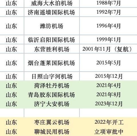 另一個經濟大省山東,也正瘋狂建機場。菏澤牡丹機場、青島膠東國際機場、濟寧大安機場分別于2021年4月、2021年8月、2023年12月建成通航。此外,棗莊翼云機場已經于2022年開工,聊城民用機場項目也在積極推進中,于5月剛剛進行選址意見批前公示。